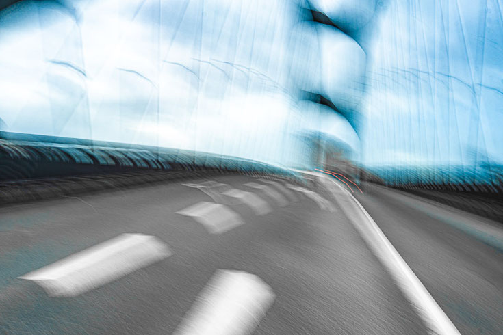 durch die Bewegungsunschärfe wie ein Tor – oder gar wie ein bedrohliches Gesicht. Die Brücke vervielfacht sich, beginnt zu schwingen, und der Weg nach vorne wirkt wie eine Bewegung in eine andere