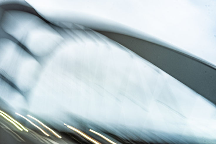 The Honsell Bridge in Frankfurt curves gracefully across the image. Through motion blur, its structure transforms into a flowing ribbon of light and form – as if
