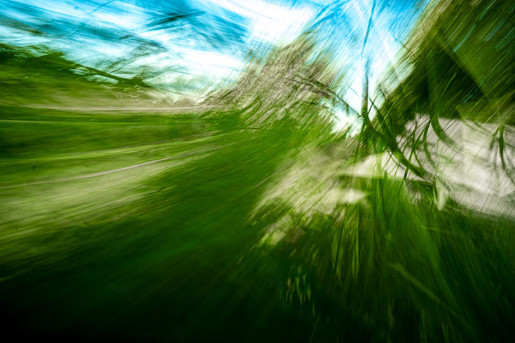 Gräser und Bäume verschwimmen zu einer dynamischen Bewegung, die den Himmel mit einbezieht. Es wirkt, als würde die Landschaft selbst atmen und sich in Licht und