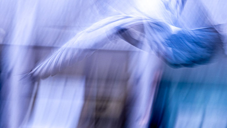 Even a single pigeon breaks apart into lines and motion, with only the wingbeat remaining visible. Everything else merges with the city – an image made of pure