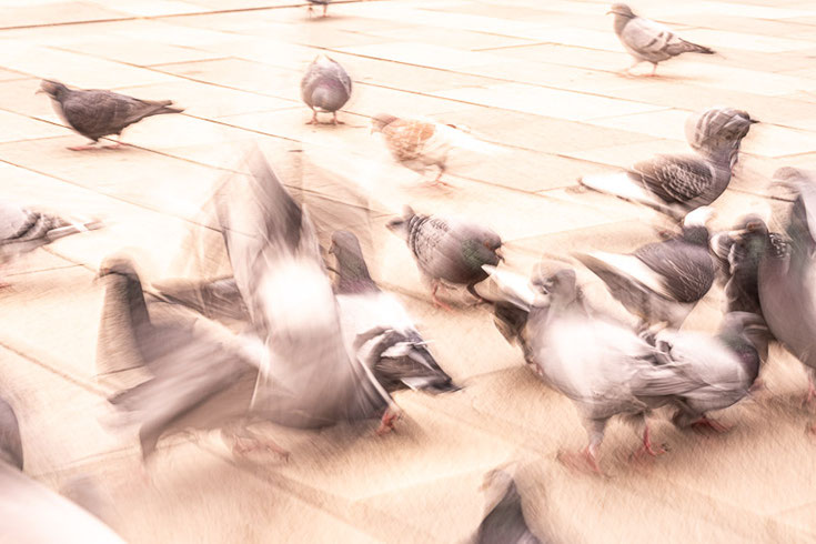 A flock of pigeons whirls across the square, some still, others in frantic motion. Just like the birds themselves, the lines and contours of the image are in