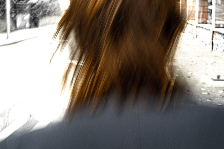 Der Blick auf den Hinterkopf einer Frau, das Haar zerfließt in Bewegungsunschärfe. Es wirkt wie eine vibrierende Aura aus Farbe und Energie.
