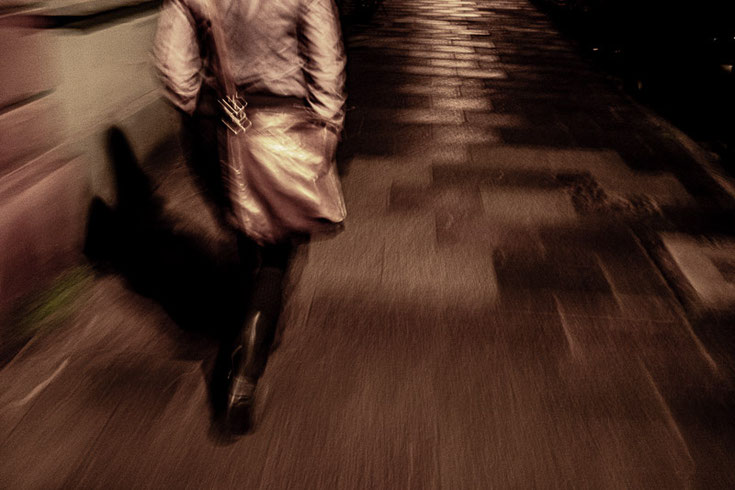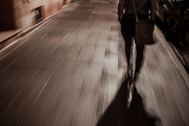 Eine Person geht über einen nächtlichen Gehweg, der Schatten dehnt sich lang aus. Bewegung und Dunkelheit verleihen dem Bild etwas Filmisches.