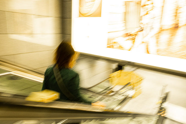 A woman rides an escalator past a large billboard. Her figure blurs while the advertisement remains sharp and glaring – a contrast between transience and commerce.