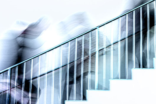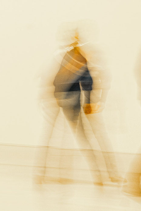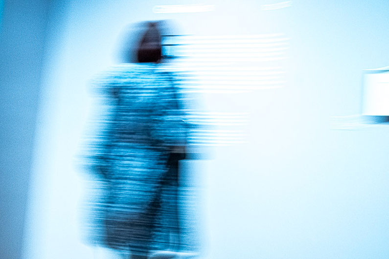 Eine einzelne Person bewegt sich durch den Raum, die Bewegungsunschärfe vervielfacht ihre Silhouette zu einem grafischen Gebilde. Die Figur erinnert dabei an eine