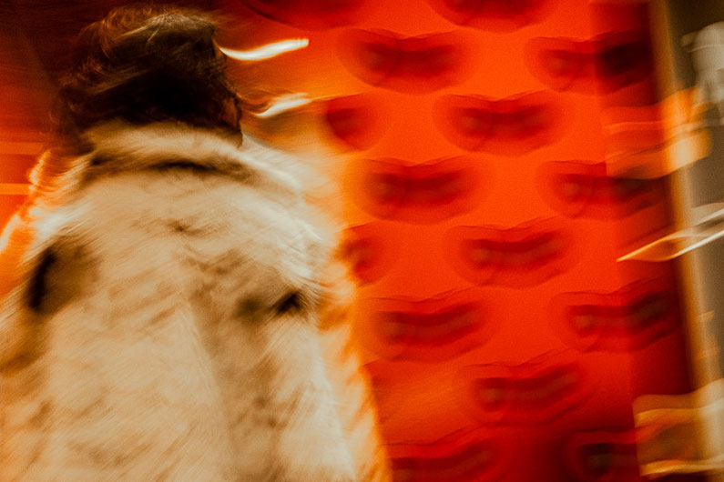 A man in a striking fur coat moves through a Pop Art exhibition at Berlin’s Gropius Bau. The motion blur makes the background patterns shimmer and interact with his