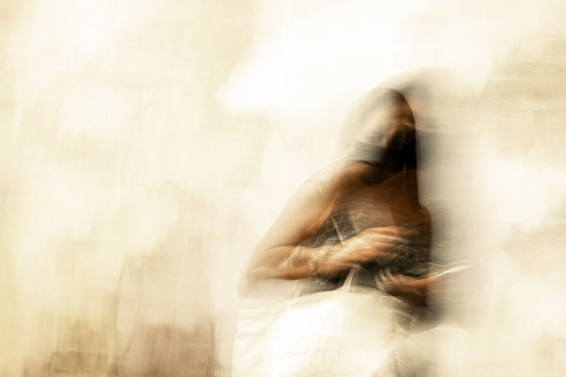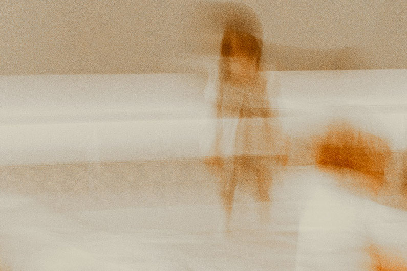 A woman stands in front of an artwork. Motion blur dissolves her contours, yet the face mask and her faint expression give the image an unexpected emotional depth – between protection,