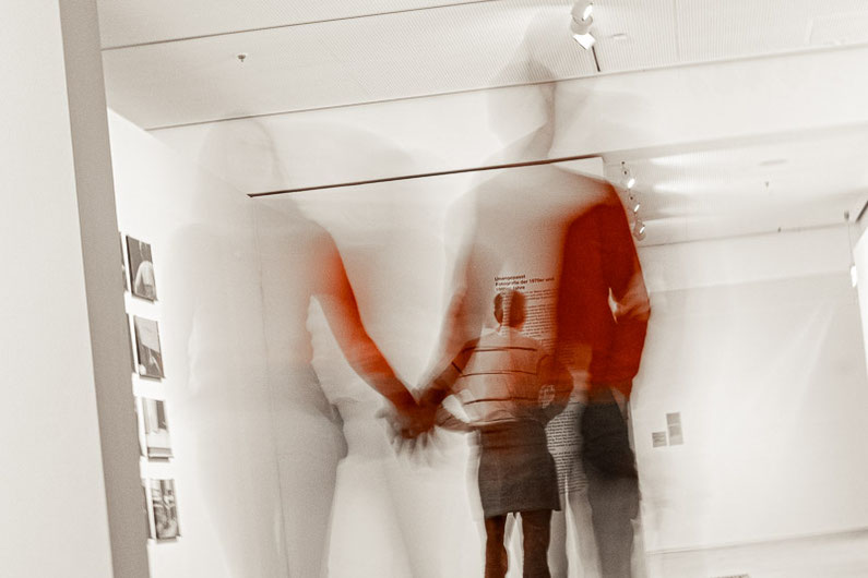 Several people move through an exhibition space, their figures made transparent and overlapping by the blur. It creates the impression of ghosts wandering among the